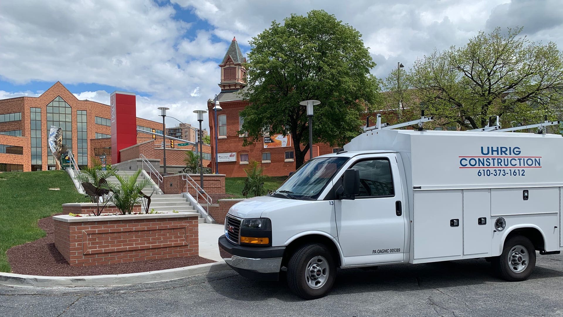 Bucks County Community College has three campuses in Bucks County. Uhrig Construction worked on an exterior renovation project at their main campus in Newtown, Pennsylvania. This project required approximately five acres of improvements throughout the outdoor spaces of the campus. New sidewalks, curbs, masonry work, railings, landscaping, and a new water fountain was installed on the property.